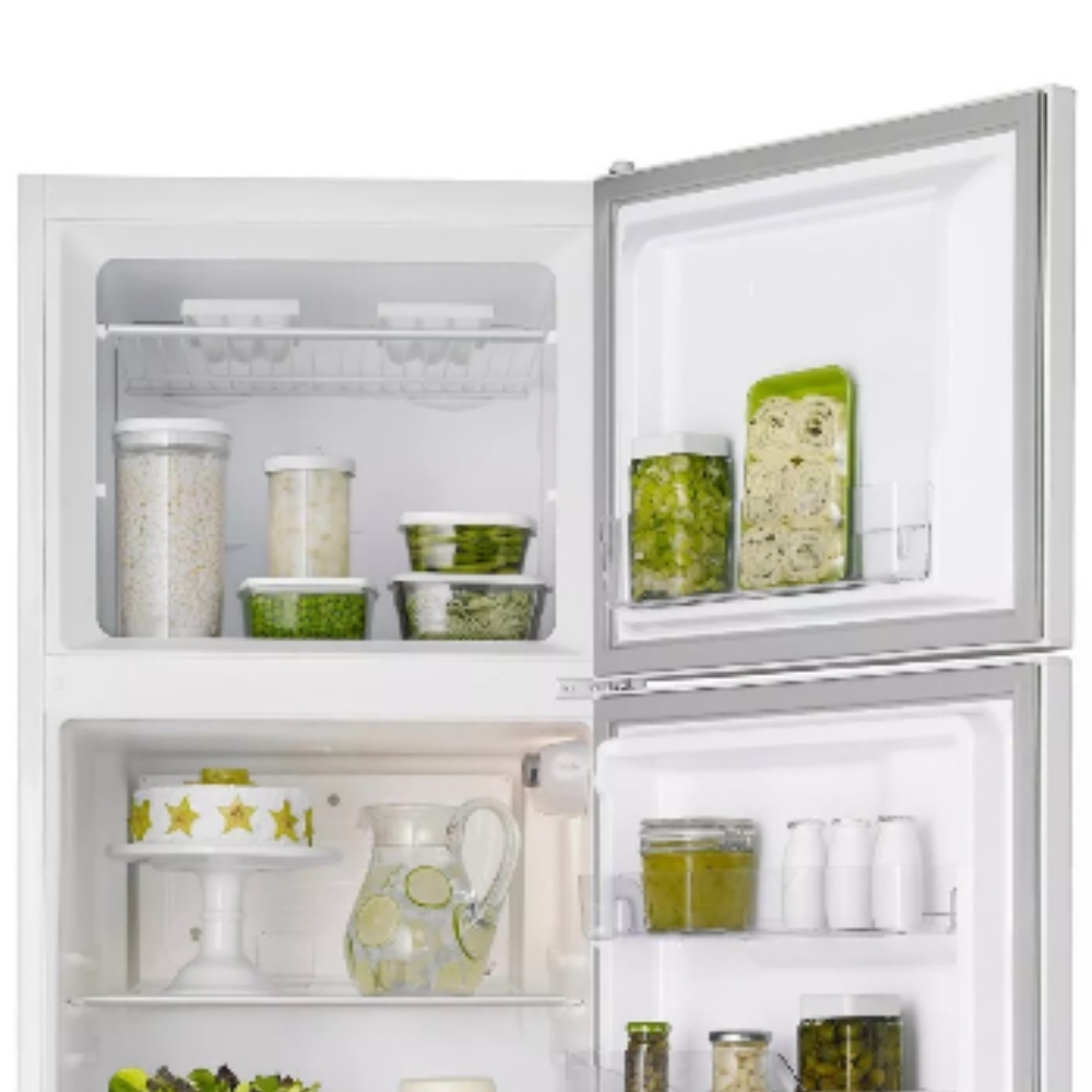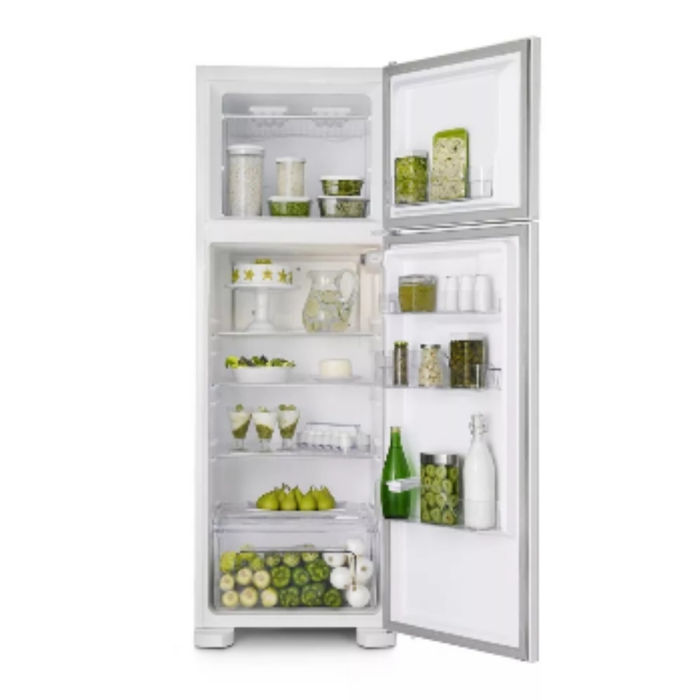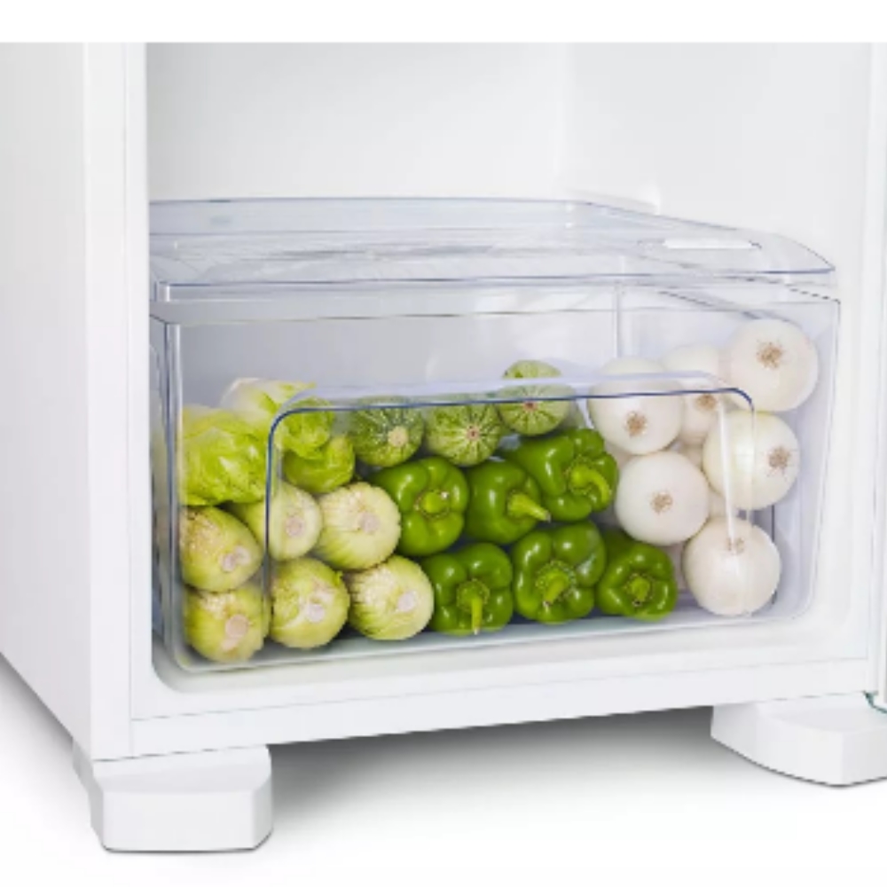 Refrigerador Cycle Defrost 362L Branco (DC44) Com novo design e puxador integrado, o Refrigerador duas portas DC44 possui prateleira porta latas reversível para 5 unidades, porta-ovos removível para 12 unidades, prateleiras aramadas removíveis e Super Freezer -18ºC. Design Moderno que Combina com a Cozinha Puxador embutido, bonito e fácil de limpar Prateleira Porta-Latas Reversível para 6 Unidades Prateleiras Aramadas Ajustáveis no Refrigerador Oferece flexibilidade no ajuste da altura das prateleiras, conforme a necessidade de cada consumidor 2 Formas de Gelo Maior quantidade de gelo e melhor organização Cesta Porta-ovos para 12 Unidades Armazena e transporta os ovos com facilidade e segurança Prateleira para Garrafas de até 2,5 L Acomoda melhor as garrafas, ajustando-as para que não caiam quando a porta é aberta Gavetão Transparente de Frutas e Legumes Amplo espaço proporcionando maior organização e melhor visualização dos alimentos